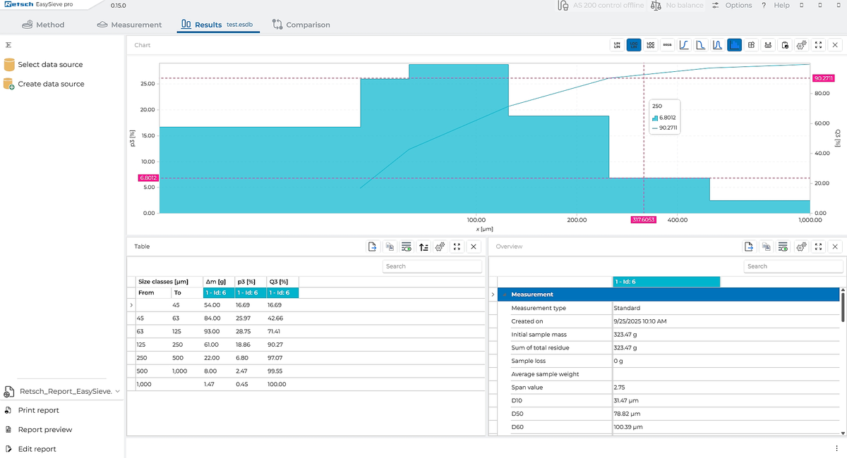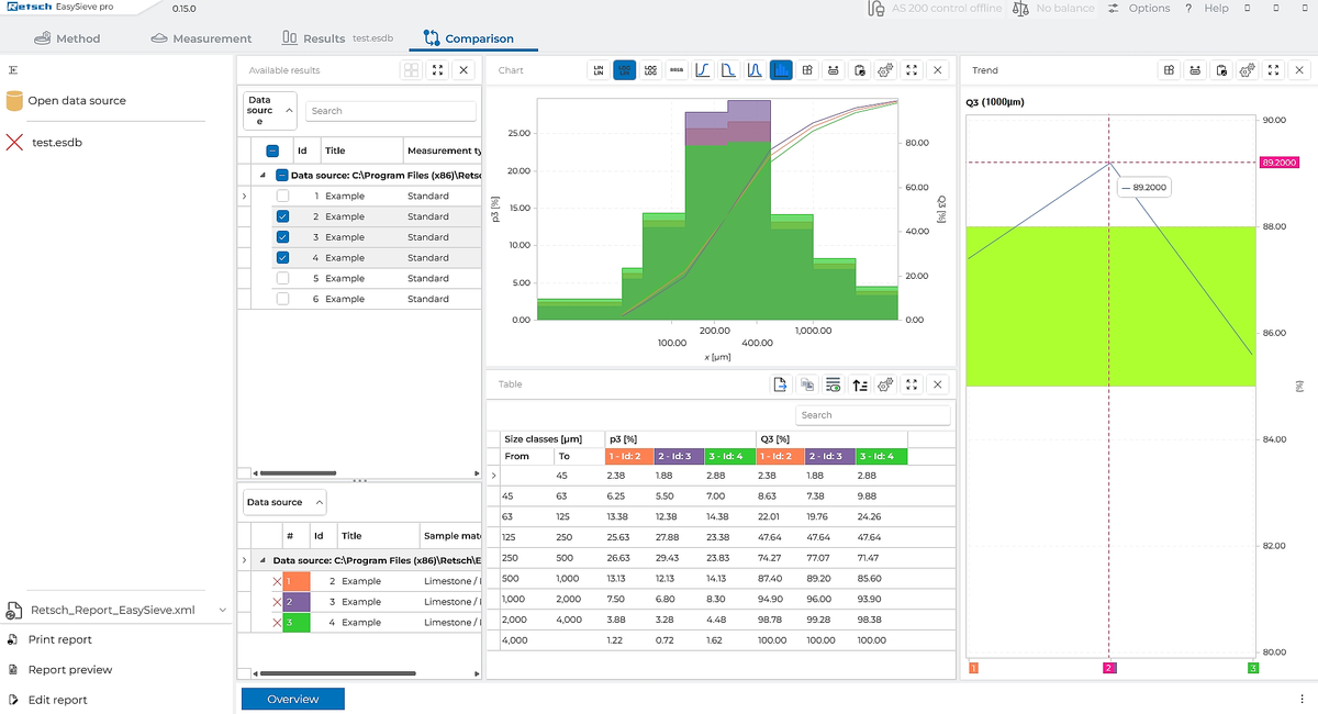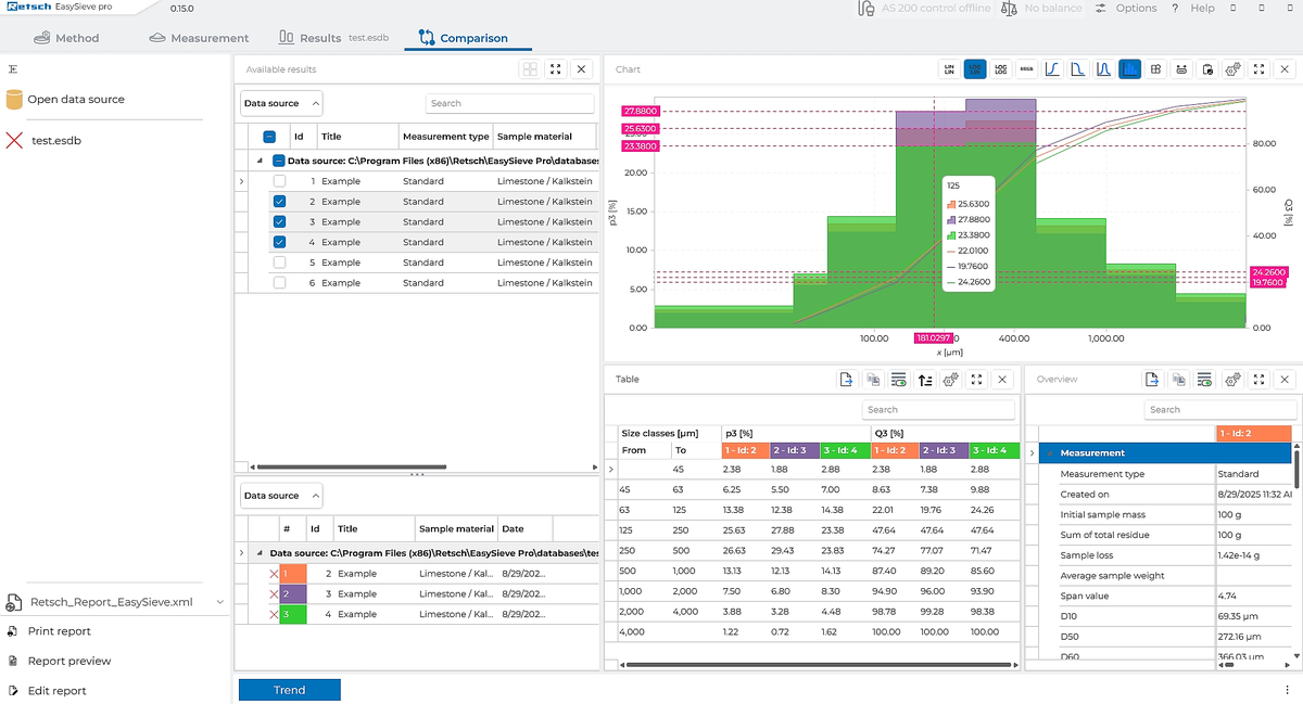 Met een trendanalyse kunt u uw zeefanalyses altijd in het oog houden. Door meerdere zeven te vergelijken met behulp van vrij te kiezen parameters, kunt u afwijkingen in een vroeg stadium identificeren en ervoor zorgen dat uw kwaliteitsnormen worden gehandhaafd - eenvoudig en betrouwbaar.