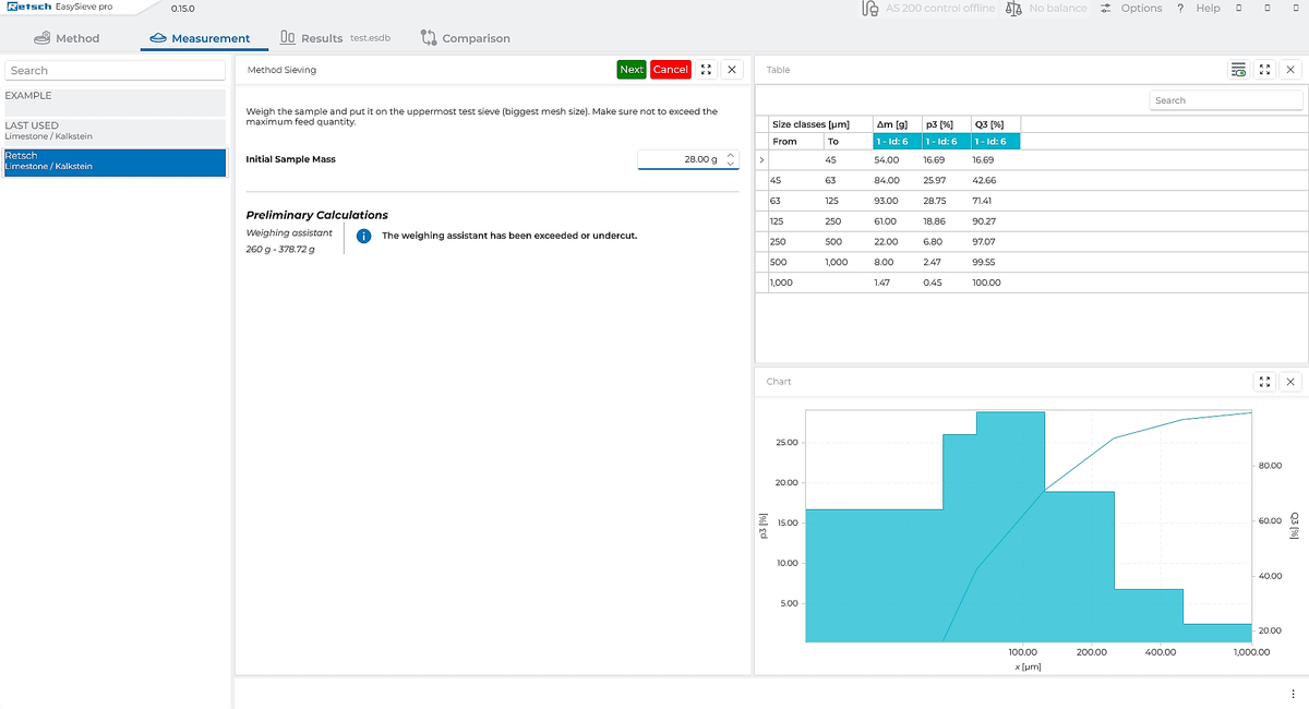 Zorg ervoor dat u RETSCH-zeven gebruikt om te profiteren van onze nieuw ontwikkelde weegassistent, die direct de optimale zeefbelasting aanbeveelt. Dit helpt u verkeerde resultaten door over- of onderbelasting te voorkomen en bespaart u onnodige herhalingen. Een bekend probleem: verschillende monstermaterialen maken het correct laden tot een uitdaging. EasySieve pro | Pharma neemt deze zorg van u weg: na het invoeren van de bulkdichtheid van het monster toont het systeem u het optimale weegbereik. Uw zeven wordt reproduceerbaar en betrouwbaar.